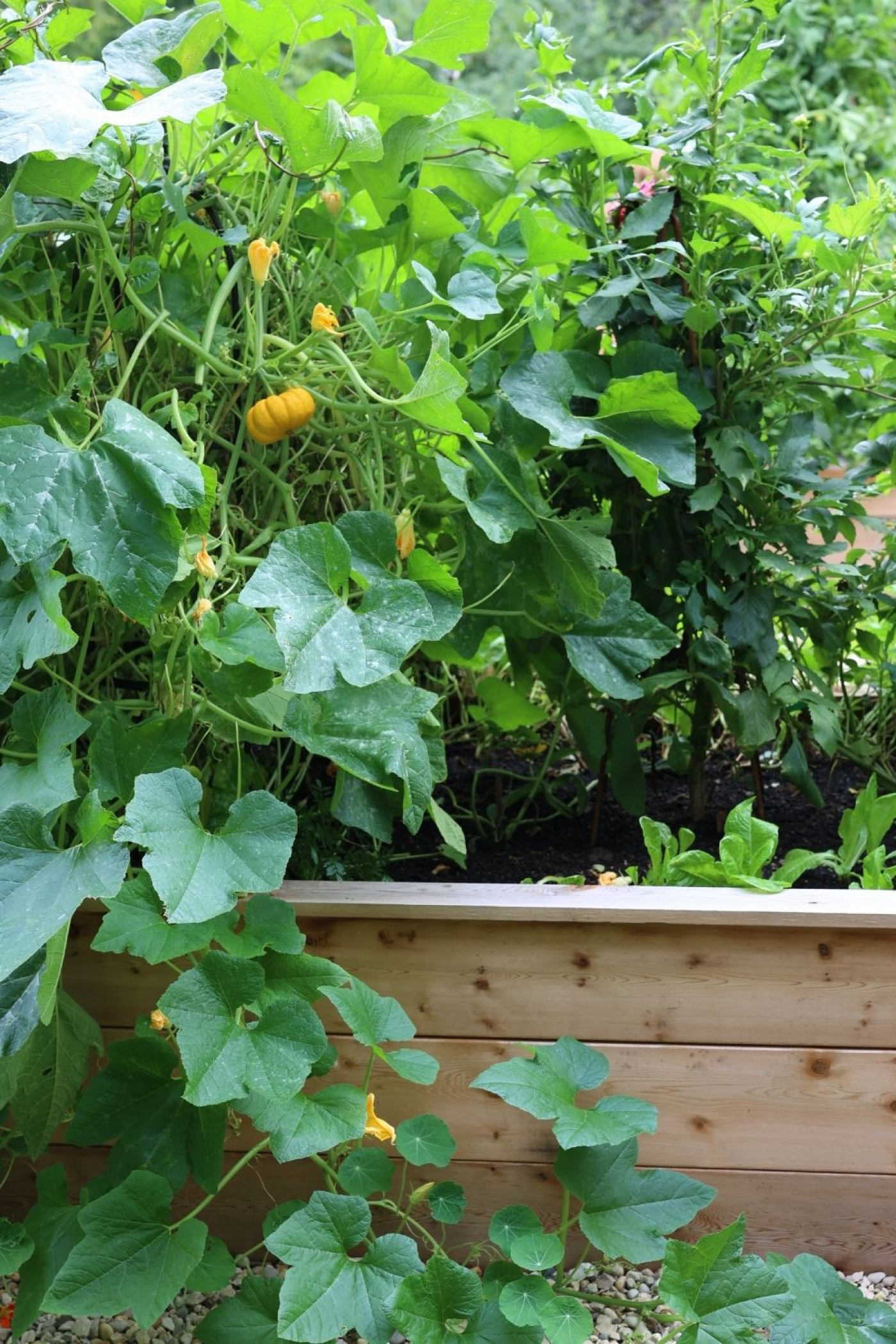 - Easier harvesting — you can see every pumpkin developing on the vine without getting on your hands and knees and hunting through a ground-level jungle of leaves.