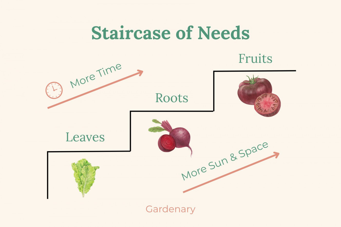 At the top are fruiting plants like tomatoes, peppers, zucchini, and peas. These are incredible crops, but they require the most sunlight, the most space, and the longest wait.