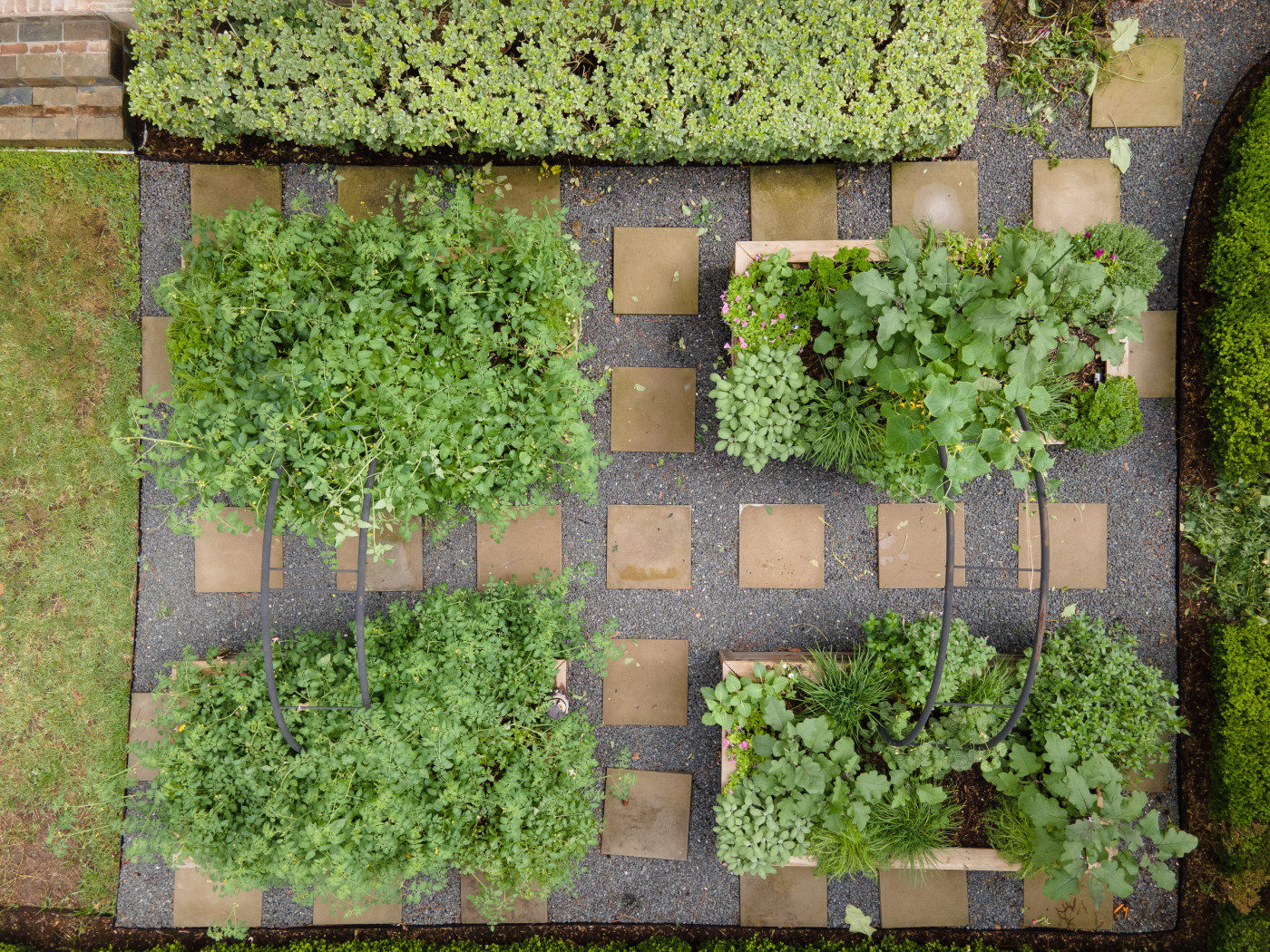 - Leafy greens are planted along the edges for easy, frequent harvesting