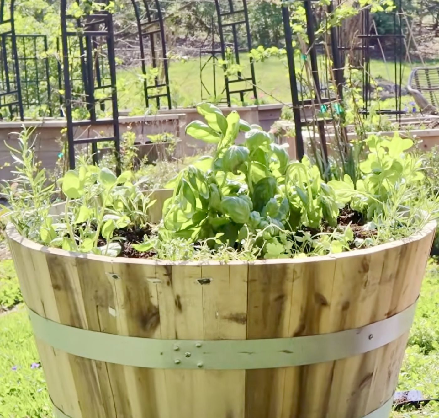 Divide that large multi-plant basil into two halves and plant one on each side of the center. The result is a basil tower — a lush, full mound of basil rising up from the middle of the barrel. It looks incredible, and it produces abundantly all season.