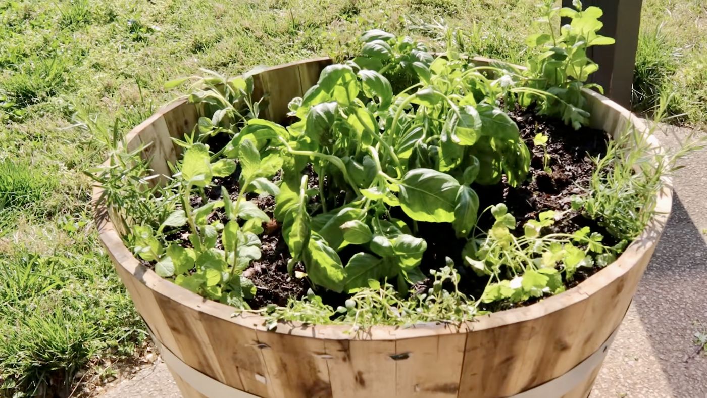 The center of a whiskey barrel for plants holds moisture longest — water naturally settles toward the middle as it moves through the soil. This makes the center the perfect position for basil, the thirstiest herb in this planting.