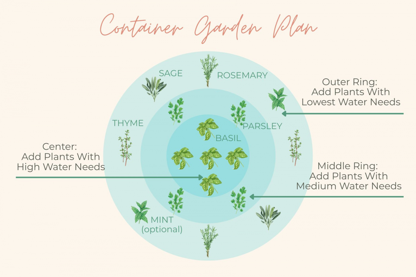 Picture a target with three concentric rings. Each ring is a watering zone. The outer ring represents the zone that gets the least amount of water because the outer part dries out fastest in containers. Every herb gets planted in the zone that matches its needs.