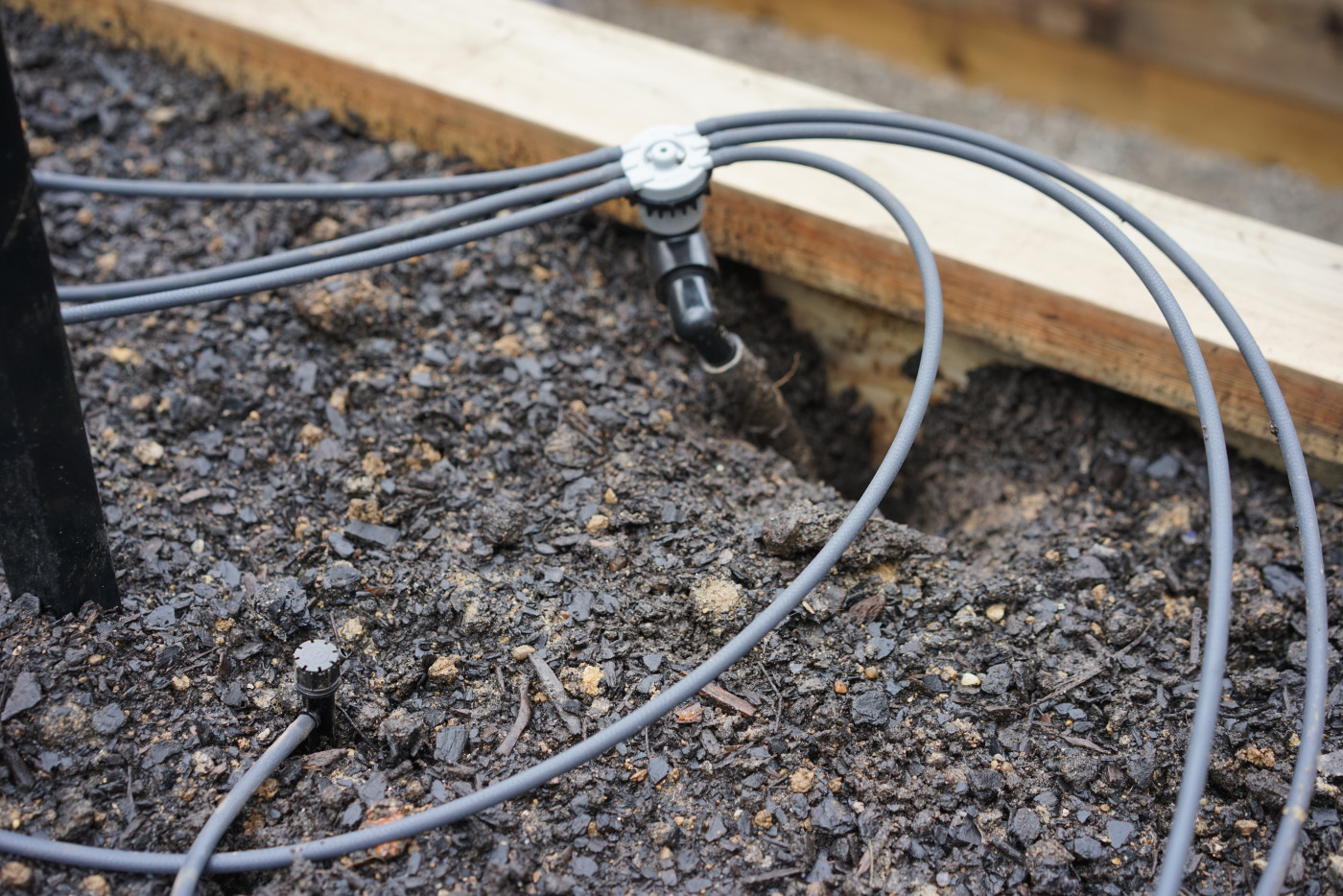 We tied the garden into an existing irrigation system and created a separate zone specifically for the raised beds. This matters because raised beds need a gentler, more targeted watering approach than lawn sprinklers.