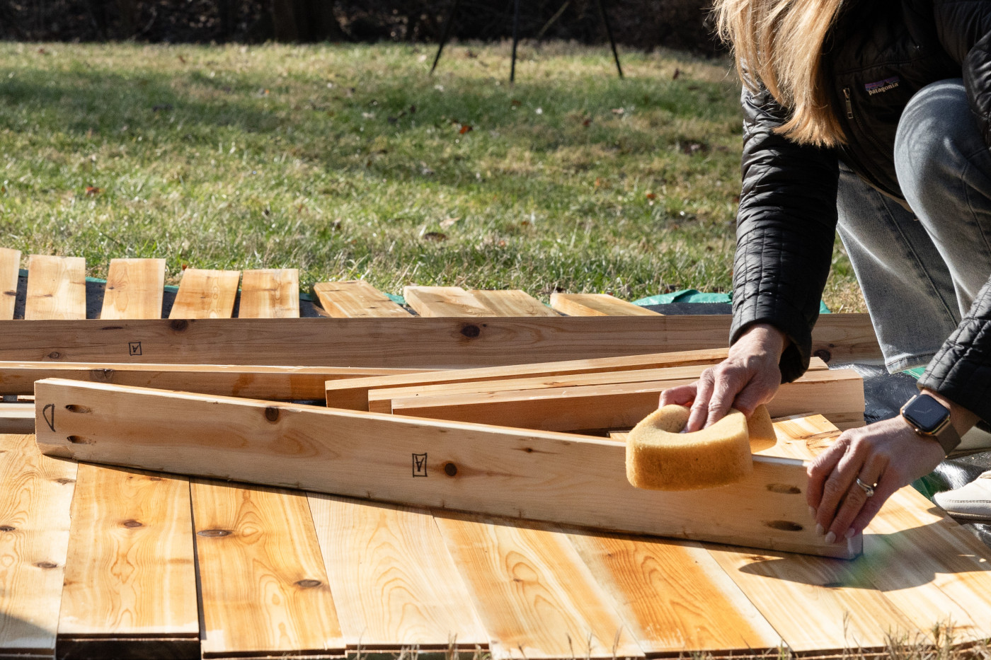 We laid all the boards out, used a sponge to apply the stain evenly, and let everything dry before assembling anything. That part took time, but it was worth it.